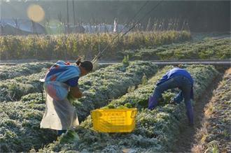 | 冬季新菜地的霜冻 | 冬季菜地工人早上摘菜 |